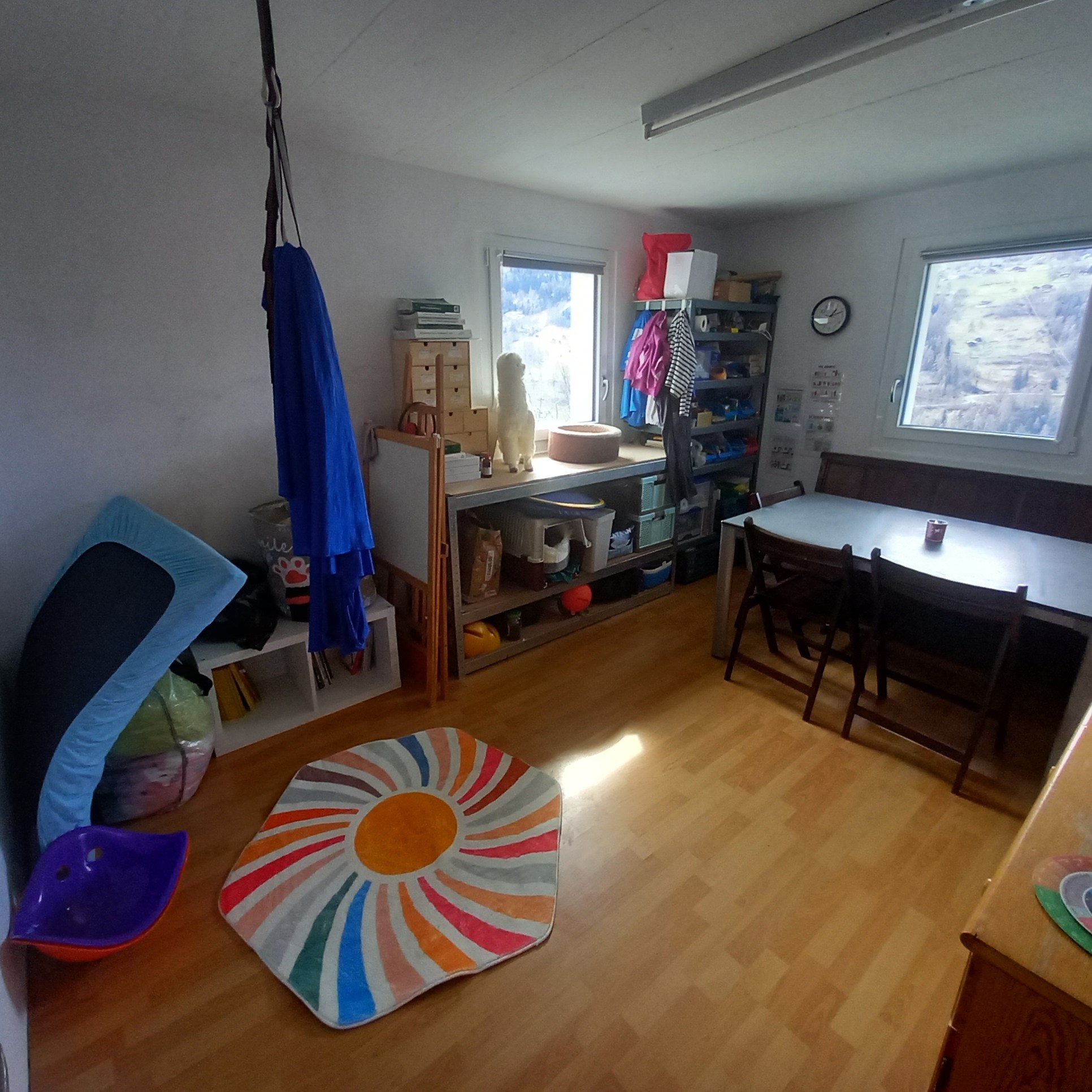 En cas de moment de décompression de l’enfant, peluche et couverture lestées, drap de danse pour faire un cocon, ballon sensoriel, balançoire, il y a moyen de créer rapidement un environnement adapté.